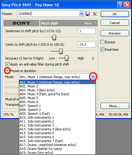 Menu Effects → Pitch → Shift… permite alterar a velocidade que o som é produzido, é uma opção bastante utilizada para criação de efeitos de voz lenta e voz rápida. Podemos aplicar um filtro clicando na opção Apply an anti-alias filter, em Accuracy editamos a precisão, baixar (Low) ou pôr mais alta (High). Se escolhermos a opção Preserve duration, vai manter-se o mesmo tempo de duração do ficheiro de áudio mesmo mudando o pitch, em Mode têm várias opções para utilizar tanto para edição de música, voz, ou instrumentos.