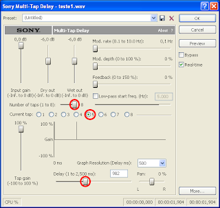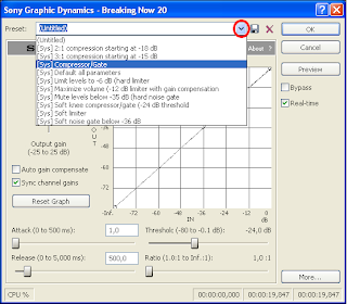 Menu Effects → Reverb… depois de executada a janela para criação dos seus efeitos, pode visualizar-se os Preset com variados locais já criados como se pode ver na figura. O Reverb também pode ser regulado manualmente como a maioria dos efeitos do Sound Forge.